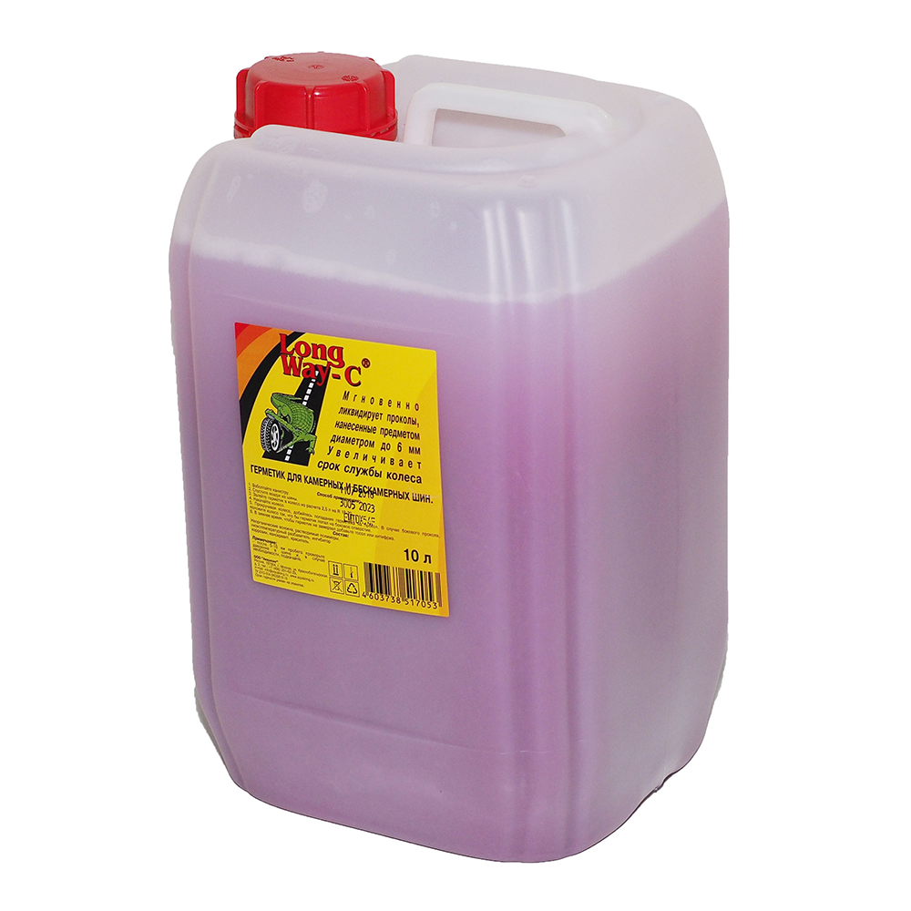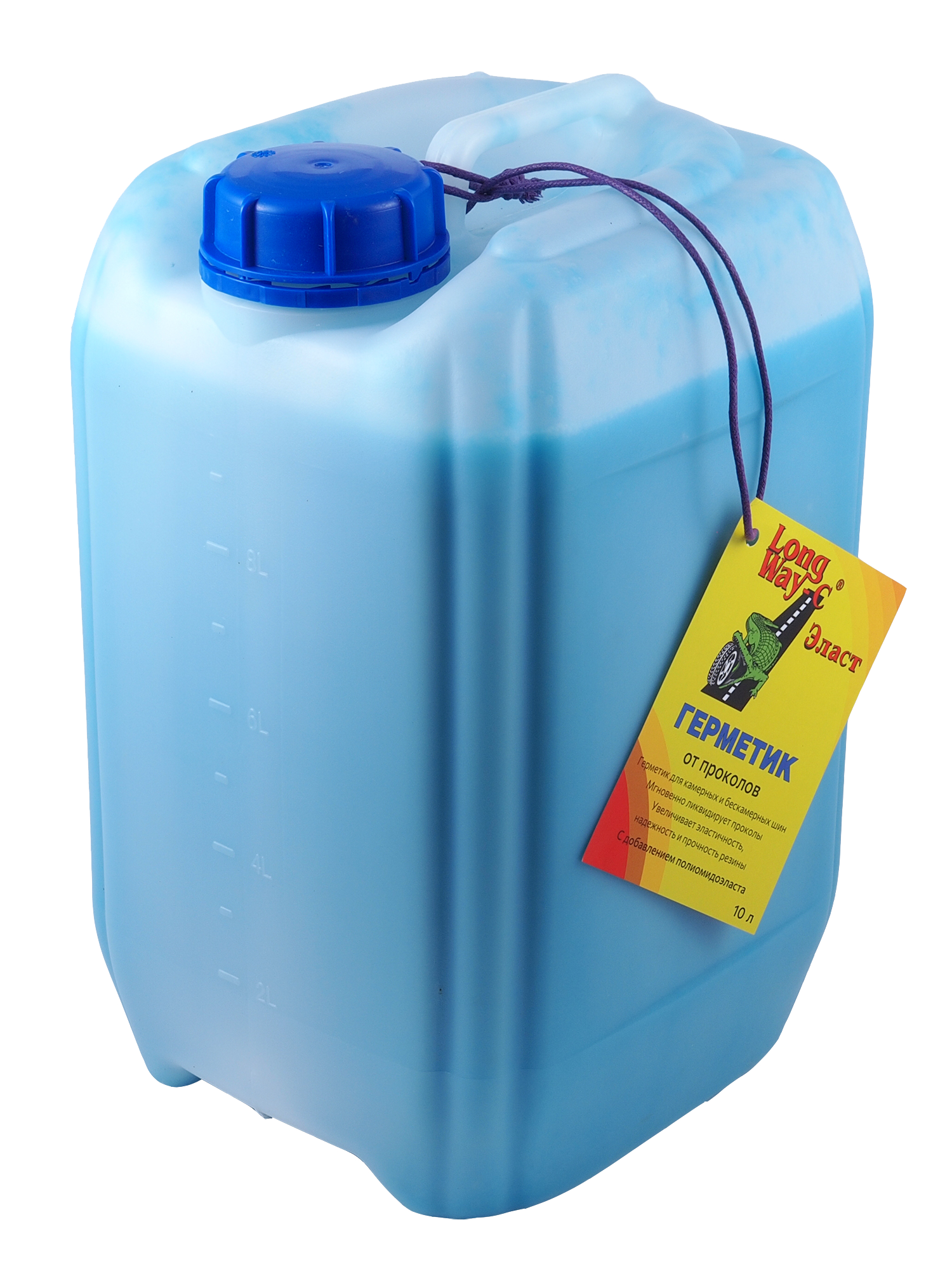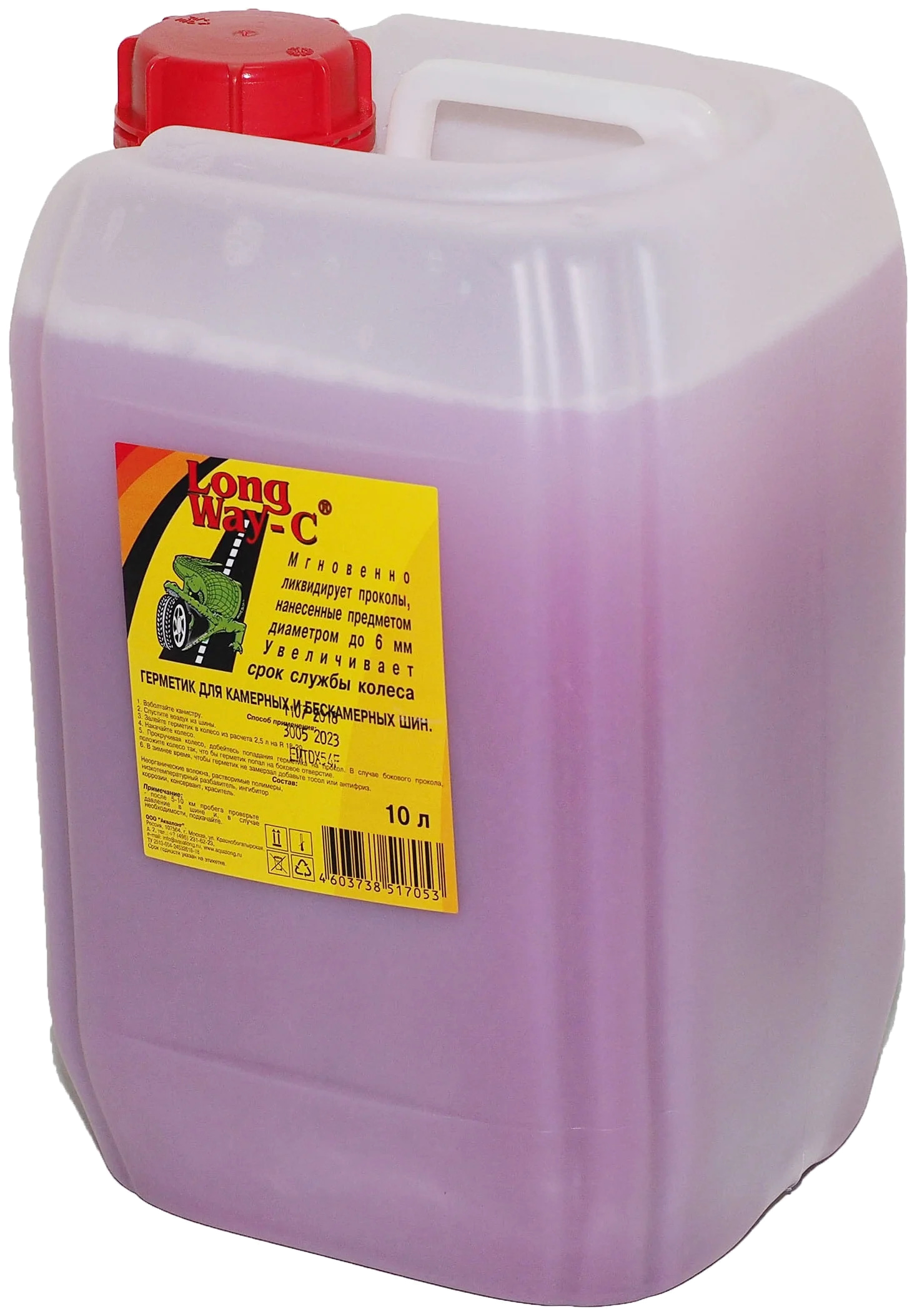 | Принцип действия герметика - под давлением воздуха герметик, попадая в отверстие, заделывает его. Герметик «LONG WAY-С» заделывает многочисленные проколы диаметром до 8 мм в зоне протектора во всех видах пневматических шин. Использовать герметик можно как средство профилактики, залив в шину без проколов, так же как и средство дорожного ремонта, т.е. после прокола. Способ применения: Взболтайте канистру. Спустите воздух из шины. Залейте герметик в колесо из расчета - 0,125л на радиус колеса R13" или 2,5 - 3 л на радиус колеса R 18-21". Накачайте колесо. Прокручивая колесо, добейтесь попадания герметика на прокол. В случае бокового прокола, положите колесо так, чтобы герметик попал на отверстие. В зимнее время, что бы герметик не замерзал, добавьте тосол или антифриз. Количество герметика, необходимое для разного диаметра шин |