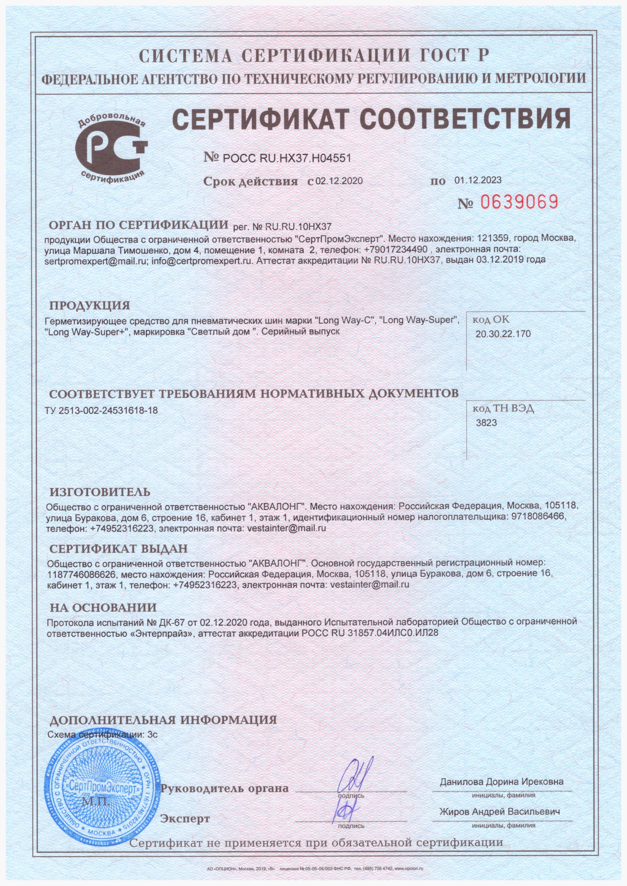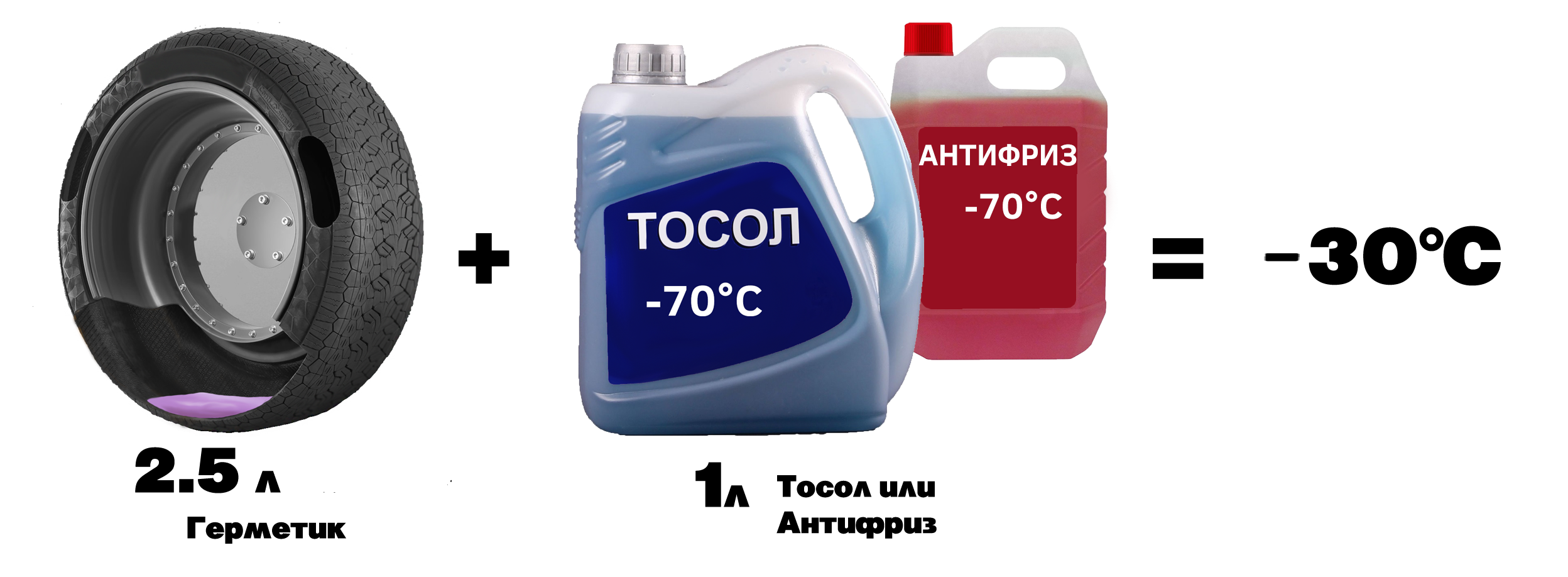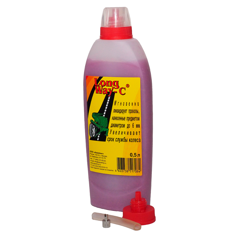 | Принцип действия герметика - под давлением воздуха герметик, попадая в отверстие, заделывает его. Герметик «LONG WAY-С» заделывает многочисленные проколы диаметром до 8 мм в зоне протектора во всех видах пневматических шин. Использовать герметик можно как средство профилактики, залив в шину без проколов, так же как и средство дорожного ремонта, т.е. после прокола. Способ применения: Взболтайте канистру. Спустите воздух из шины. Залейте герметик в колесо из расчета - 0,125л на радиус колеса R13" или 2,5 - 3 л на радиус колеса R 18-21". Накачайте колесо. Прокручивая колесо, добейтесь попадания герметика на прокол. В случае бокового прокола, положите колесо так, чтобы герметик попал на отверстие. В зимнее время, что бы герметик не замерзал, добавьте тосол или антифриз. Количество герметика, необходимое для разного диаметра шин |